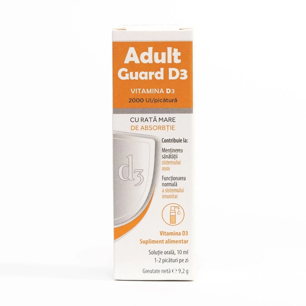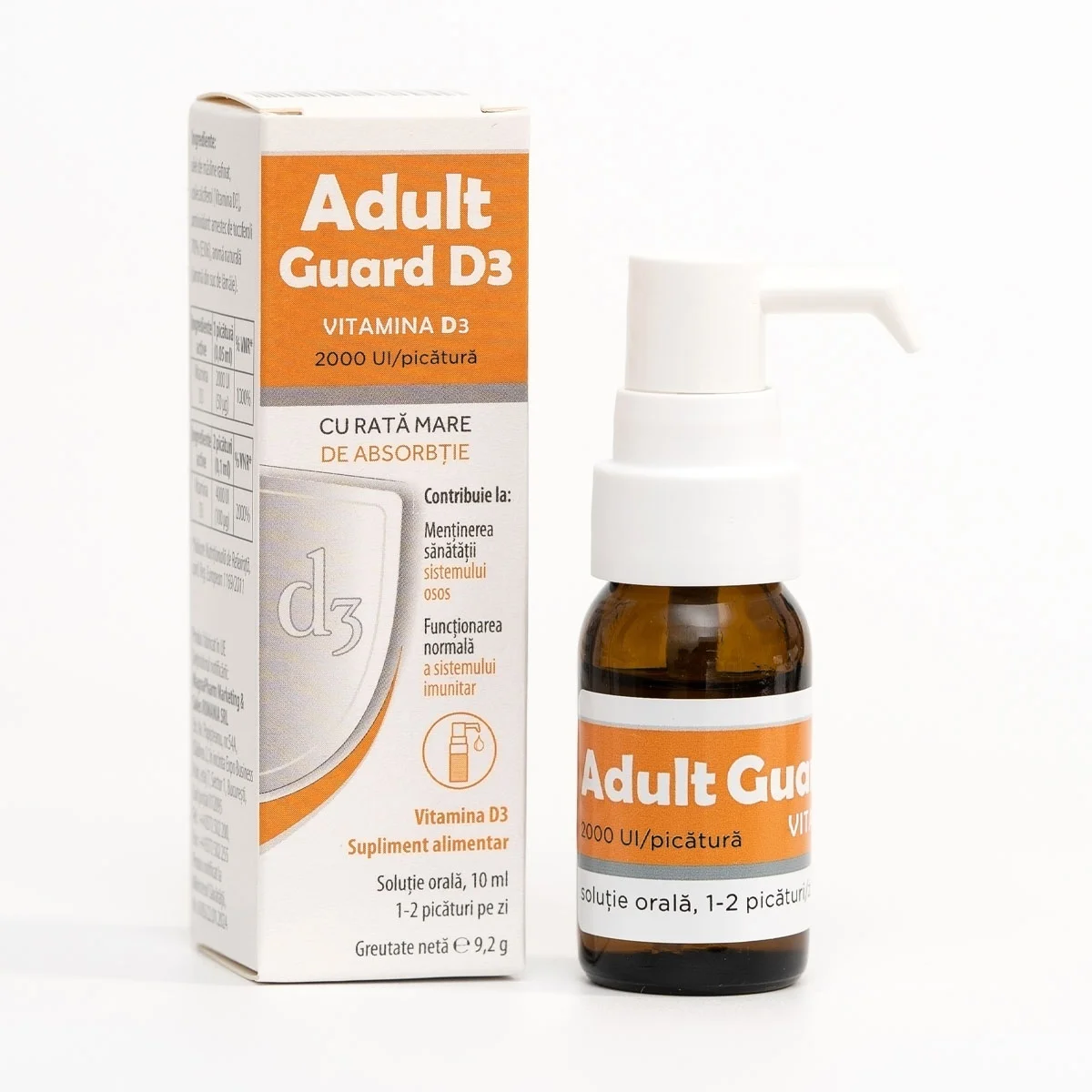 Junior Guard D3 oferă 500 UI de vitamina D3 per picătură, contribuind la dezvoltarea sănătoasă a oaselor și dinților copiilor între 3 și 18 ani.