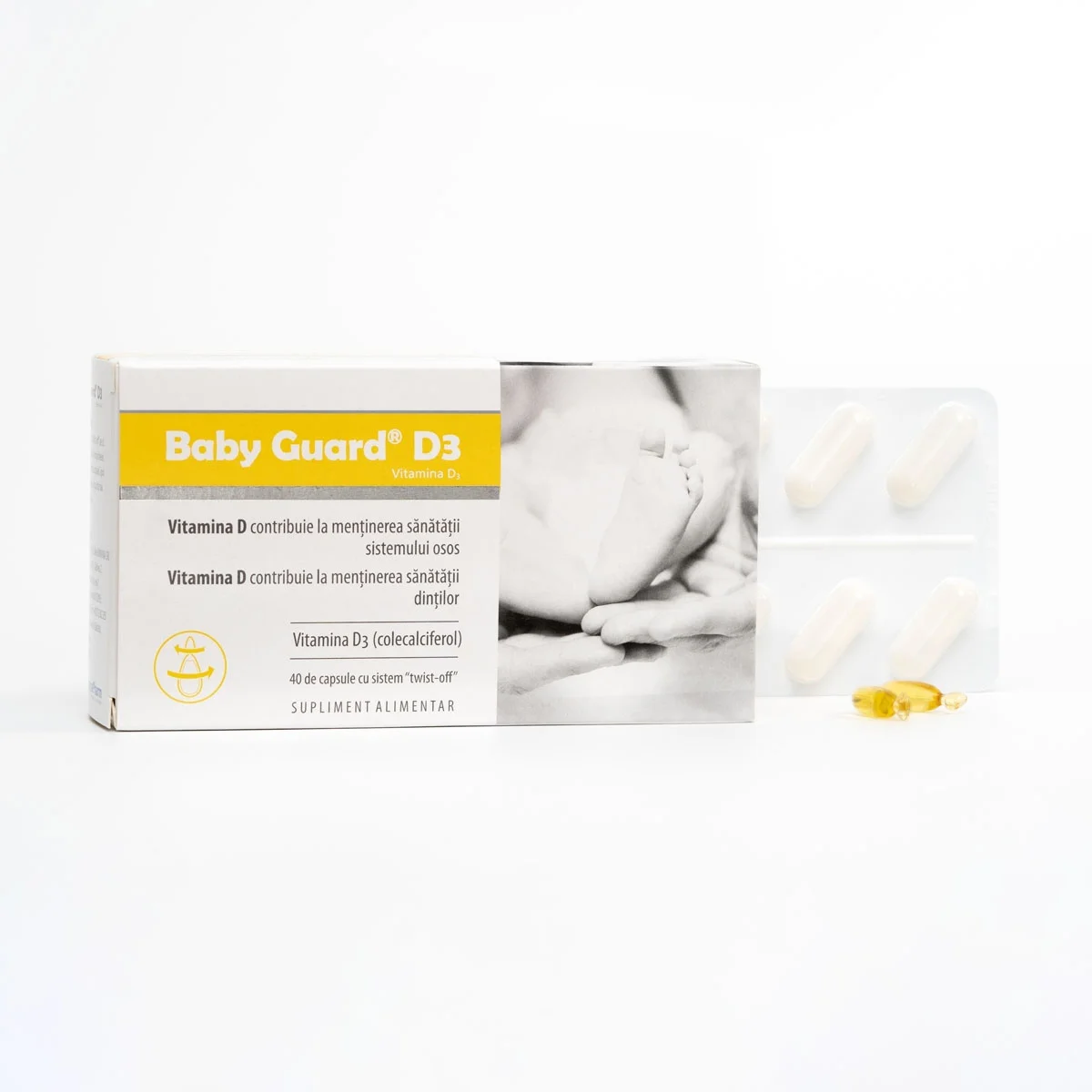 Vitamina D3 din prima zi de viață. Baby Guard D3 este un supliment alimentar destinat sugarilor și copiilor, conceput pentru a completa regimul alimentar cu vitamina D. Fiecare capsulă oferă 400 UI de vitamina D3 și are un sistem de deschidere „TWIST-OFF” pentru administrare ușoară. Capsulele sunt ambalate individual în blistere, asigurând protecția conținutului de expunerea la aer.