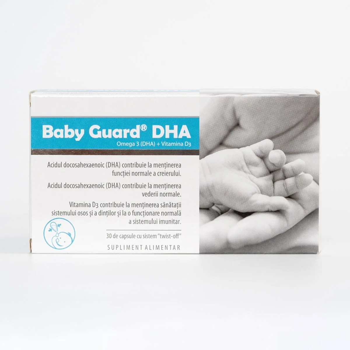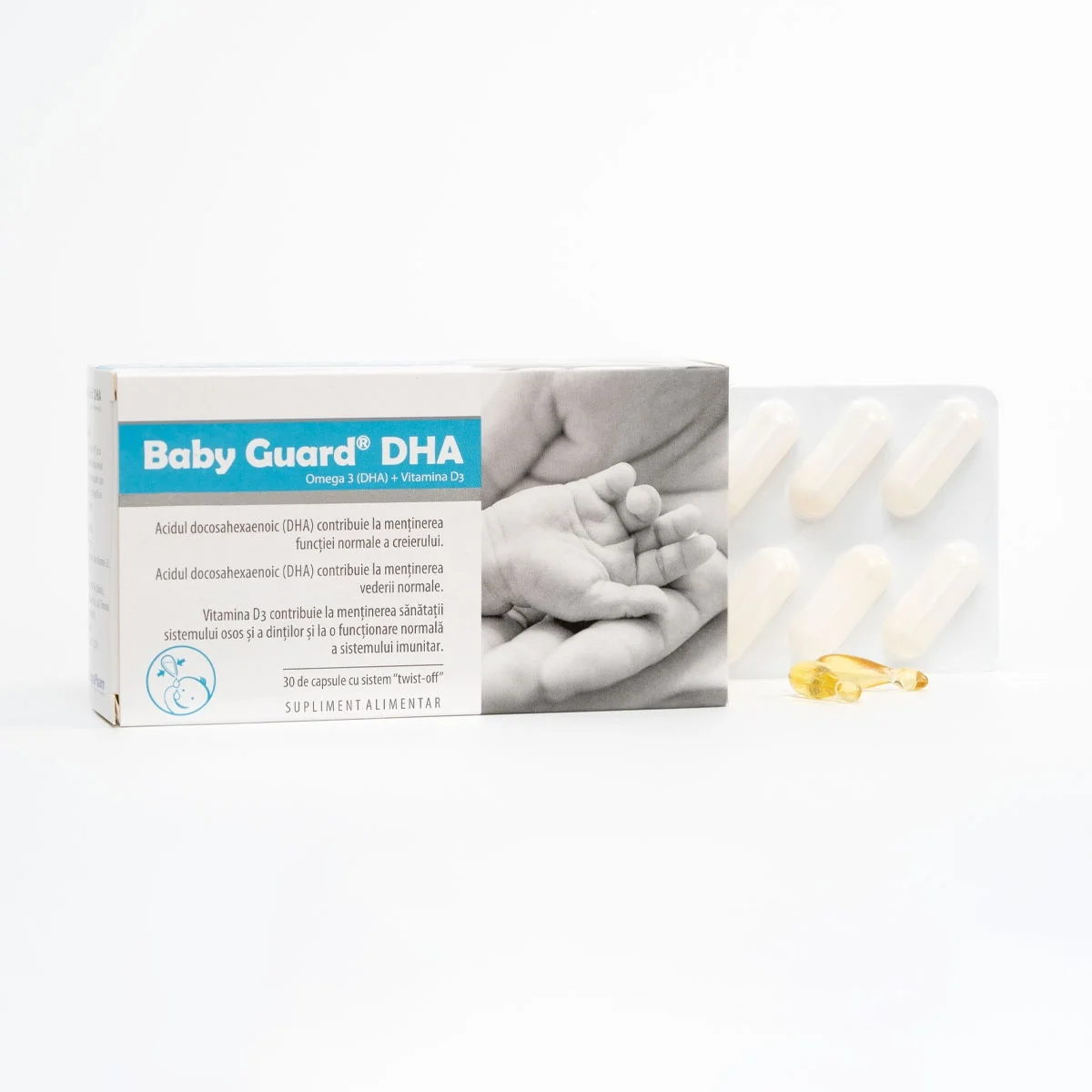 Vitamina D3 și DHA din prima zi de viață. Baby Guard DHA este un supliment alimentar destinat sugarilor și copiilor, recomandat pentru suplimentarea cu acizi grași Omega 3 (DHA) și vitamina D3. Fiecare capsulă conține 400 UI de vitamina D3 și 150 mg de DHA, și dispune de un sistem de deschidere „TWIST-OFF” pentru administrare ușoară. Capsulele sunt ambalate individual în blistere, protejând conținutul de expunerea la aer și asigurând stabilitatea ingredientelor.